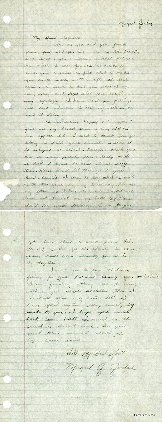 Below is a link to a surfaced love letter from one of the greatest tough guys of our years Michael J. Jordan. The letter is to a high school love. See if it takes you back.