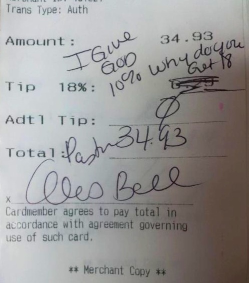 This is the merchant copy of a receipt filled out by a …wait for it…PASTOR! Waitresses live off tips. Now, we may debate the restaurant industry but the way my blog is set up…